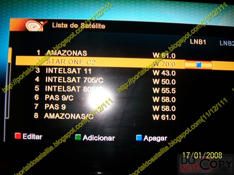 Agora você deve adicionar os satélites. Va até Lista de satélites e de OK selecione o Star One C2 (ou o ******** 1/2) no LNB 1 e o Tel Star 12 no LNB 2, como nas fotos: