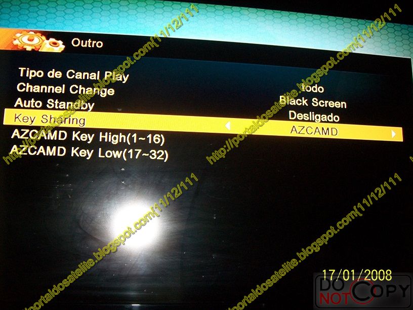 Vá até Menu: Sistema Config: Outro e de OK. Em Key Sharing coloque para o lado e marque a opção desejada. Deixe em SKS se for usar com uma antena para o C2 e outra para o T12. Já, se for usar o IKS AzCamd com uma antena no tuner 1 e o deco ligado na Internet, deixe em TSSCAM, (na foto ta como azcamd mas nas próximas versões dos FW você deverá usar somente TSSCAM). Não precisa dar ok apenas mude e deixe como quer e de um Exit. Veja na foto como fica: